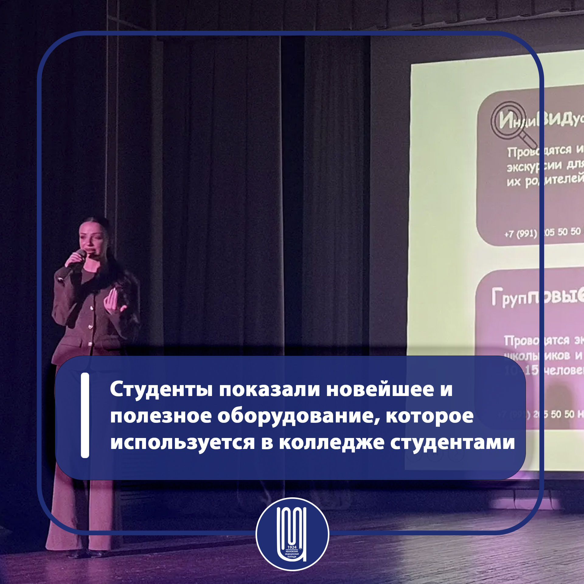 Студенты показали новейшее и полезное оборудование, которое используется в колледже студентами :визуализатор вен, переносной чемоданчик фельдшера, сердечно-легочная реанимация,а так же выступили с подробной презентацией о нашем колледже,где подробно рассказали о всех важных моментах в медицинском колледже.