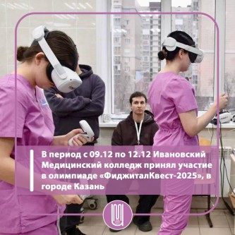 В период с 09.12 по 12.12 Ивановский Медицинский колледж принял участие в олимпиаде «ФиджиталКвест-2025», в городе Казань . Студенты демонстрировали свои навыки в виртуальной реальности с помощью Vr-очков , а так же практические навыки на манекенах. Ивановский Медицинский колледж показал командную, быструю и четкую работу , отработав профессионально все поставленные задачи !