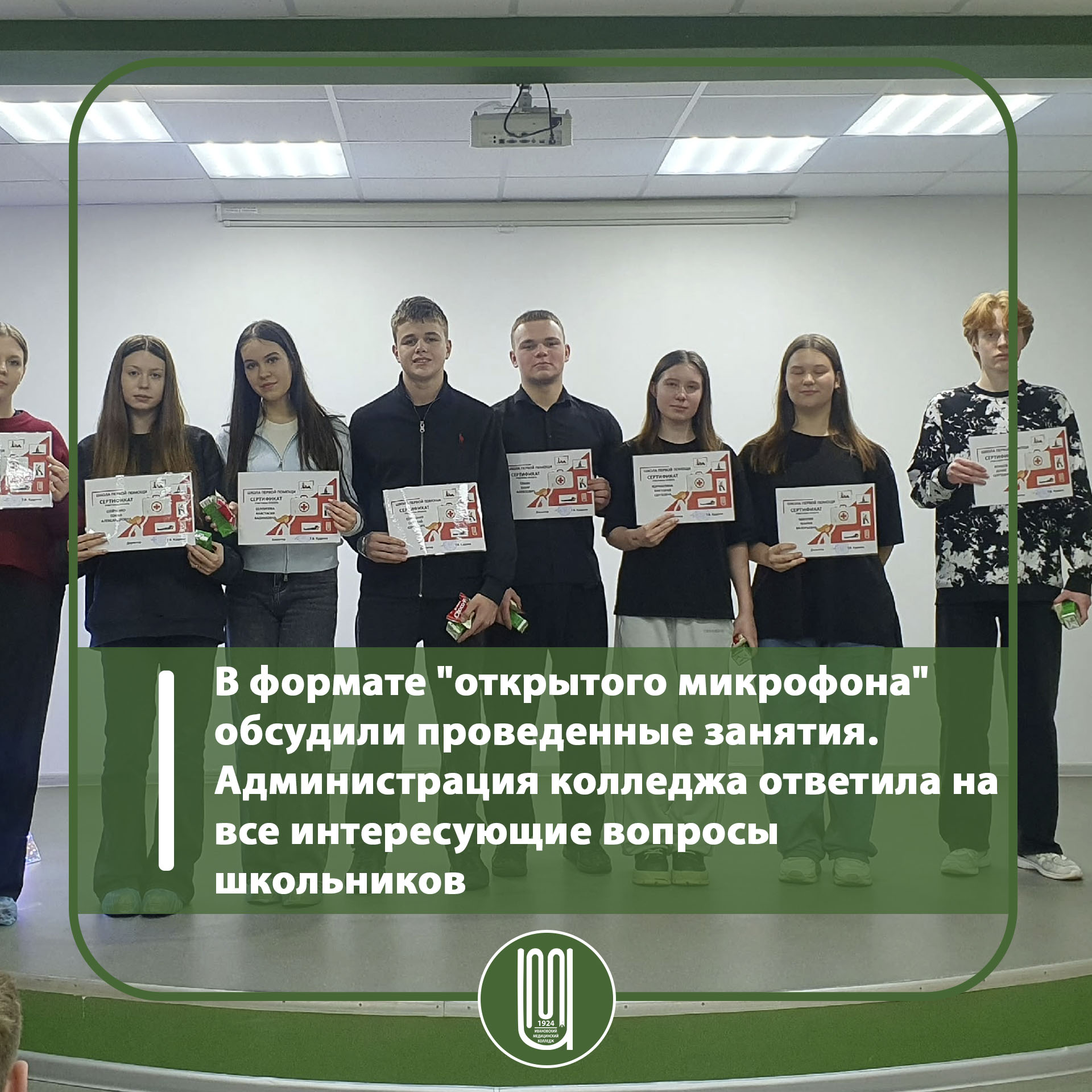 В Шуйском филиале Ивановского медицинского колледжа состоялся выпуск абитуриентов "Школы первой помощи". Ребята узнали об условиях поступления в наш колледж. В формате "открытого микрофона" обсудили проведенные занятия. Администрация колледжа ответила на все интересующие вопросы школьников. Ребятам очень понравились занятия и наши педагоги. Школьники получили сертификаты и изъявили желание участвовать в других наших проектах для будущих абитуриентов.