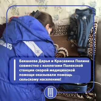 Студенты Ивановского  медицинского колледжа продолжают знакомиться  в сельским здравоохранением. В целях содействия трудоустройству в период с 19.01- 21.01. 2026г. студентки 3 курса факультета «Лечебное дело» Бакшаева Дарья и Красавина Полина совместно с коллегами Палехской станции скорой медицинской помощи оказывали помощь сельскому населению!