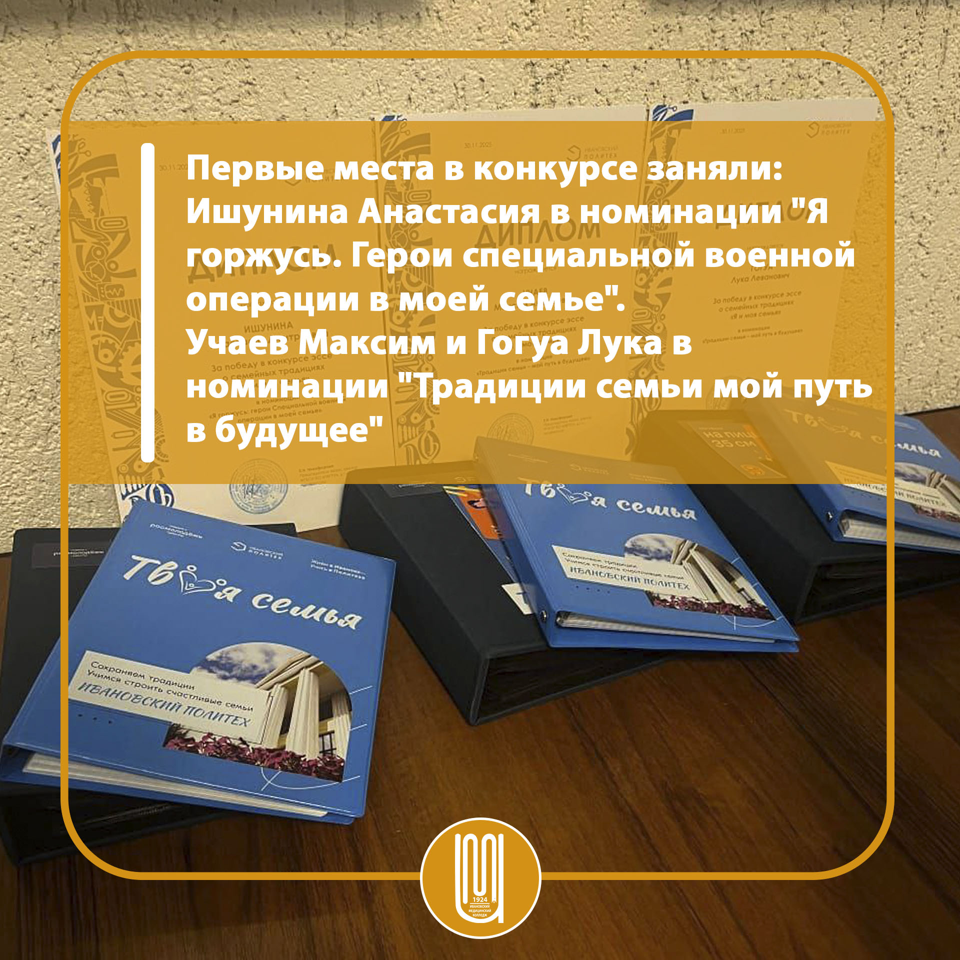 Студенты Ивановского медицинского колледжа приняли участие в конкурсе эссе о семейных традициях "Я и моя семья". Первые места в конкурсе заняли: Ишунина Анастасия в номинации "Я горжусь. Герои специальной военной операции в моей семье". Учаев Максим и Гогуа Лука в номинации "Традиции семьи мой путь в будущее". Поздравляем ребят и руководителя Корзину Светлану Сергеевну с заслуженной наградой.