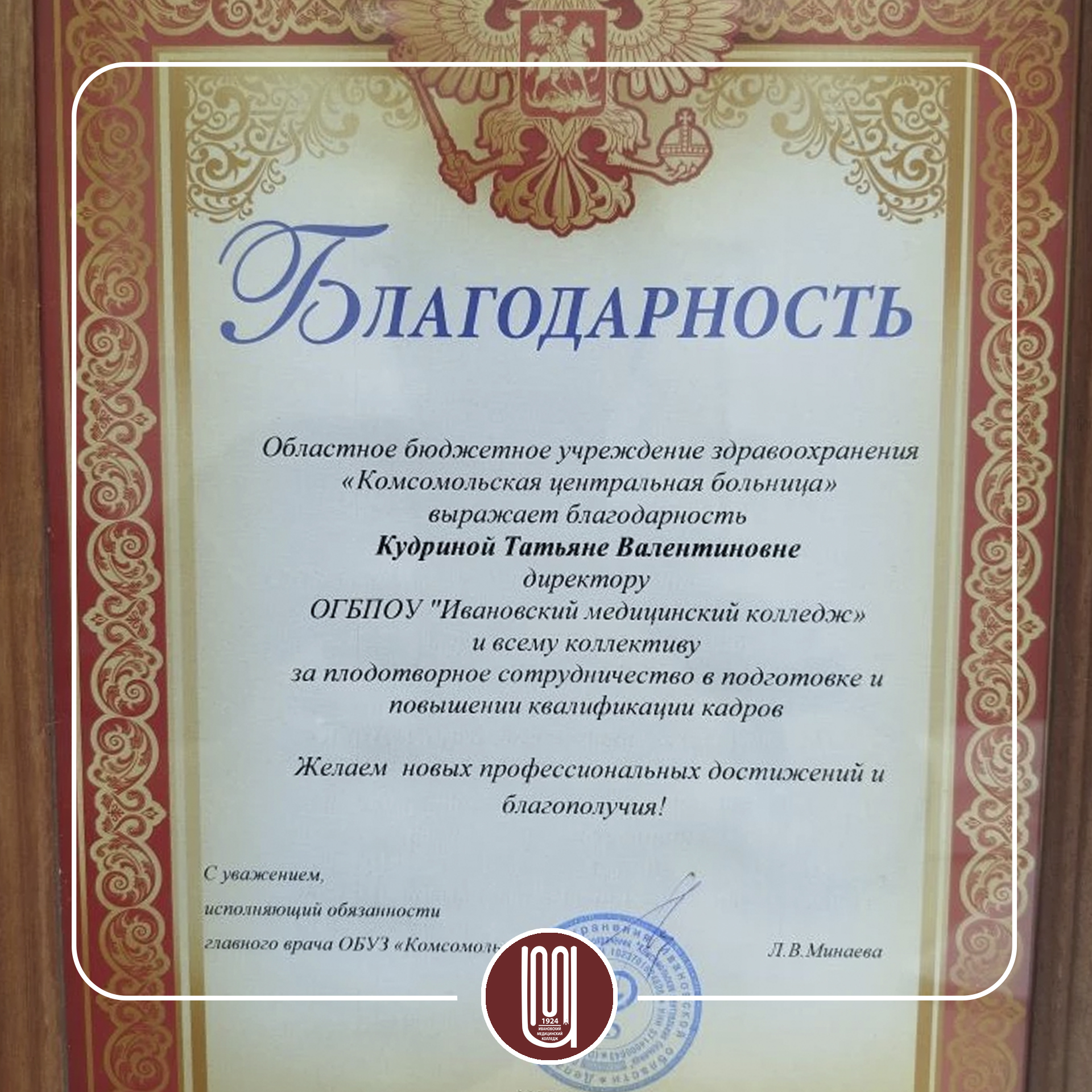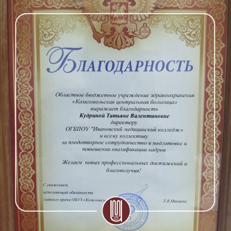 После нескольских стажировок наших ребят , колледж получил слова благодарности от Комсомольской центральной районной больницы.